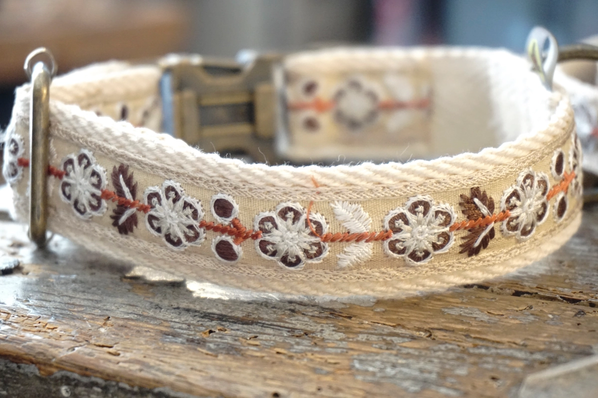 La sangle de base, de couleur écrue naturelle, s’harmonise facilement avec toutes les couleurs de pelage. Elle est sublimée par un ruban décoratif floral raffiné, apportant une touche chic et intemporelle à l’ensemble.