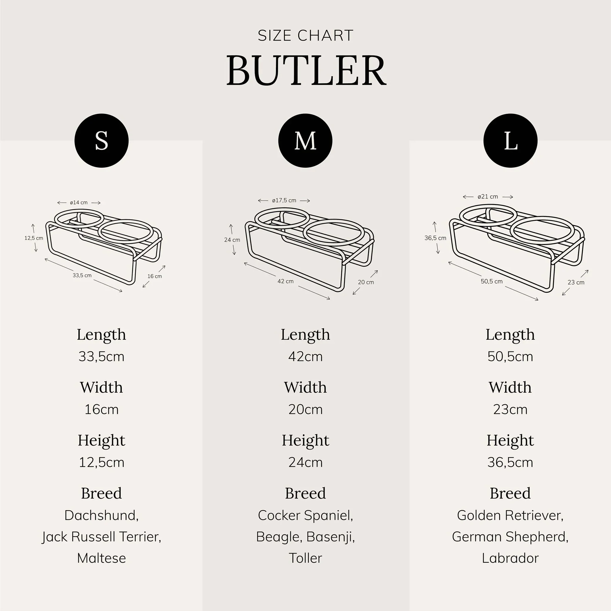 Le support BUTLER est disponible en trois tailles pour s’adapter à la morphologie des chiens.